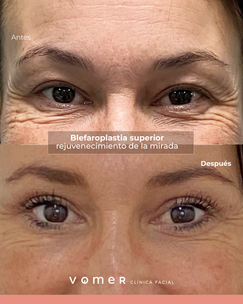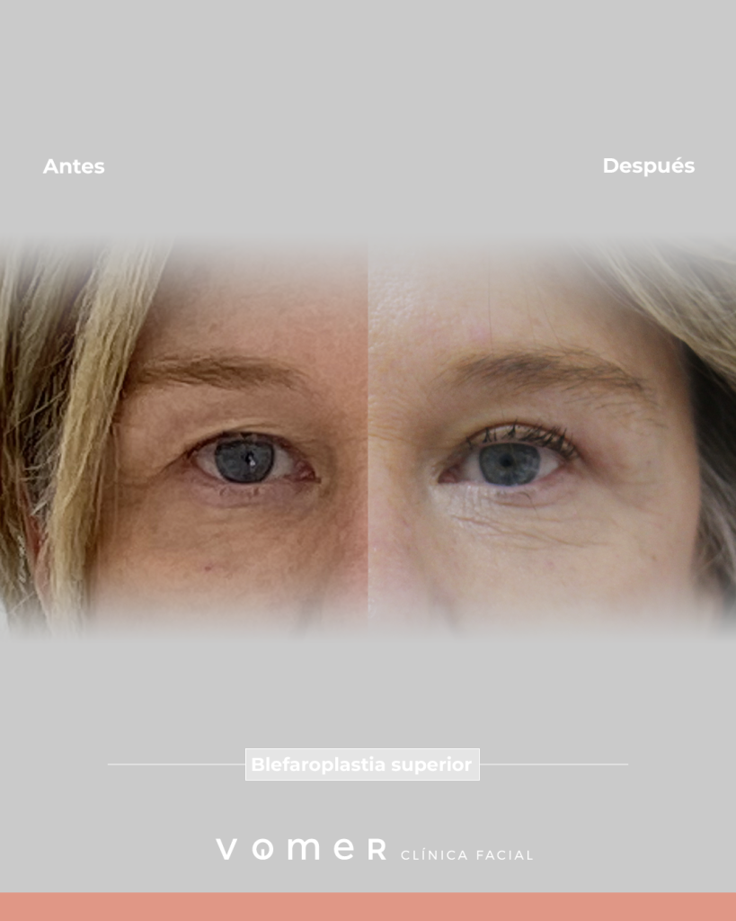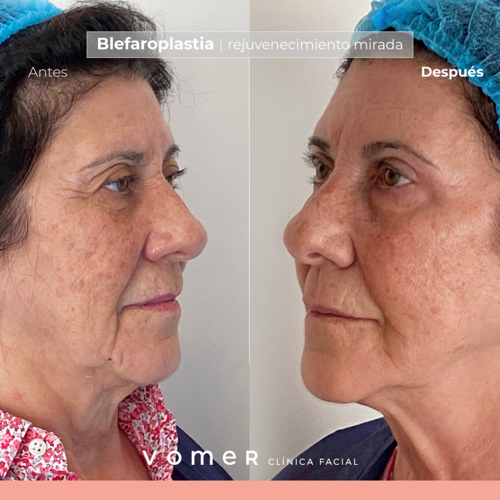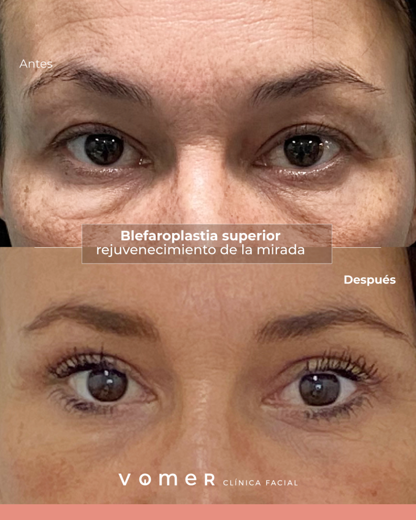 La paciente presentaba un exceso de piel y grasa en los párpados superiores y una importante protusión de las bolsas grasas en los párpados inferiores. Realizamos una blefaroplastia superior y una blefaroplastia inferior por vía transconjuntival, lo que nos ha permitido eliminar las bolsas sin cicatrices en la piel. Conseguimos un resultado totalmente natural: rejuvenecer sin cambiar la mirada.