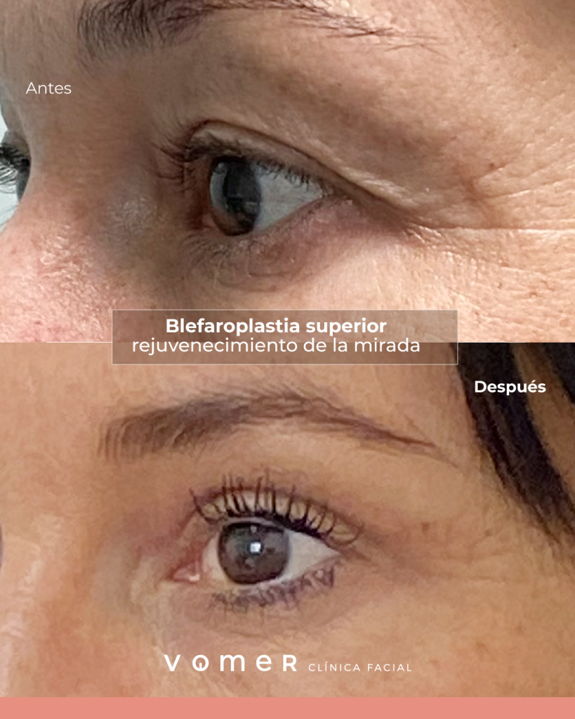 Blefaroplastia superior en paciente joven. Nuestra paciente presentaba párpados superiores caídos, lo que daba a su mirada un aspecto cansado y triste. Eliminamos el exceso de piel y grasa de los párpados superiores. De esta forma, conseguimos abrir y rejuvenecer la mirada y el rostro en general.