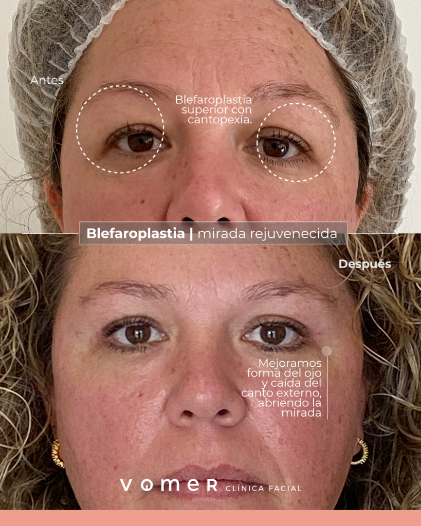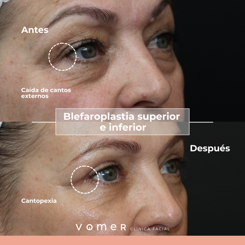 Se trata de un caso de blefaroplastia superior con cantopexia. Se puede apreciar como hemos mejorado la forma del ojo y la caída del canto externo, abriendo la mirada.