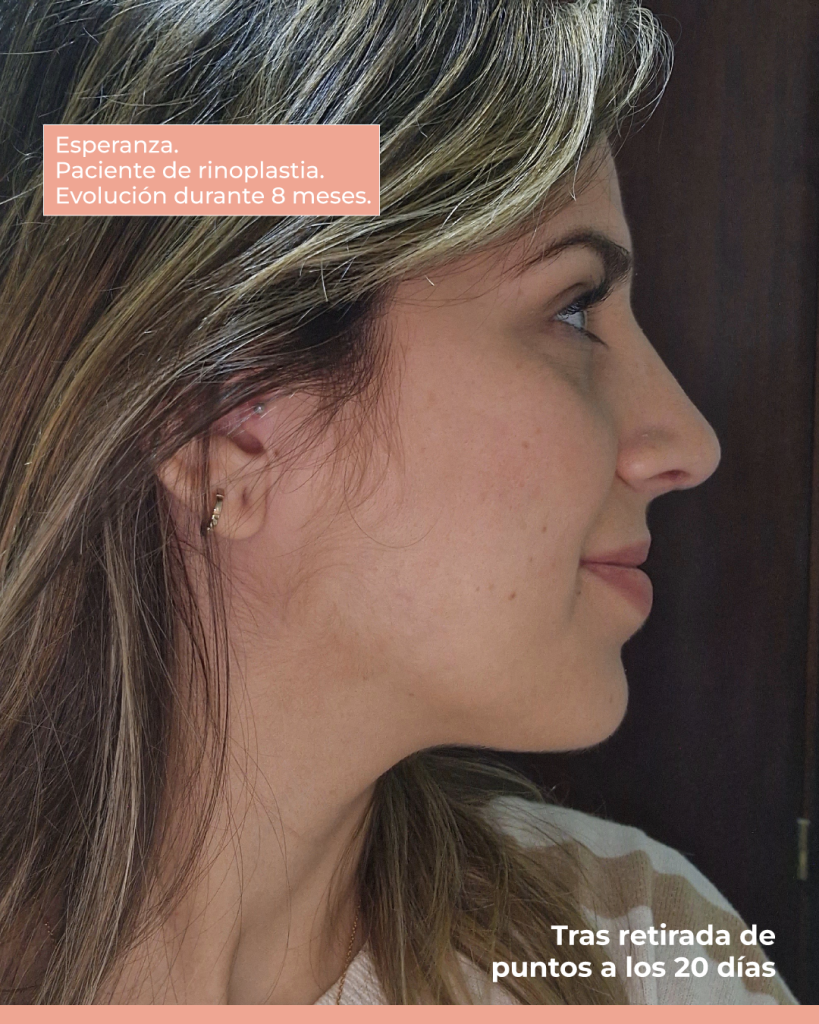 Una vez que retiramos la férula a los 7 días, ya podemos ver un gran cambio. No obstante, el resultado seguirá evolucionando hasta pasado 1 año desde la rinoplastia, que será cuando los tejidos estén totalmente asentados.